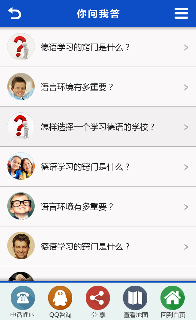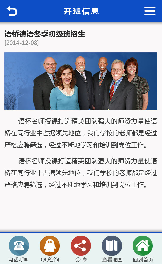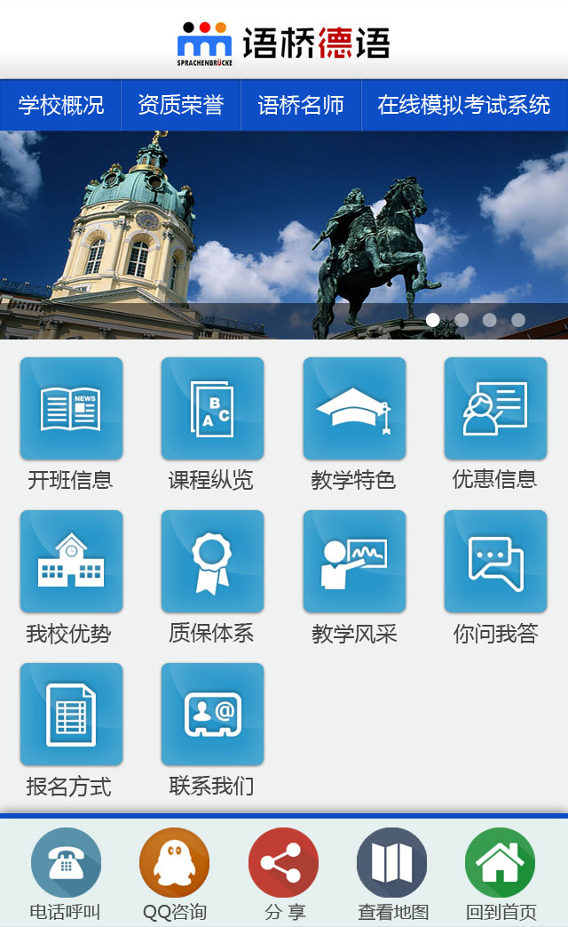 語橋德語手機網站欄目:開班信息 課程縱覽 教學特色 優惠信息 我校優勢 質保體系 教學風采 你問我答 報名方式 聯系我們